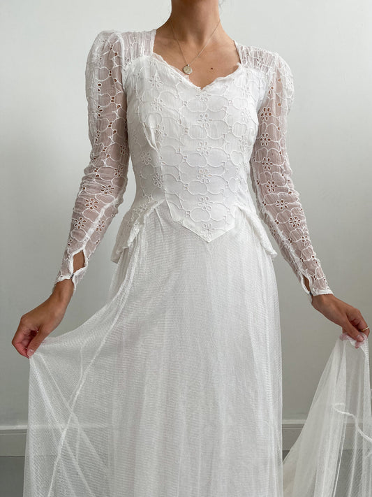 1940s Organdy Broderie and Net Wedding Dress with Train