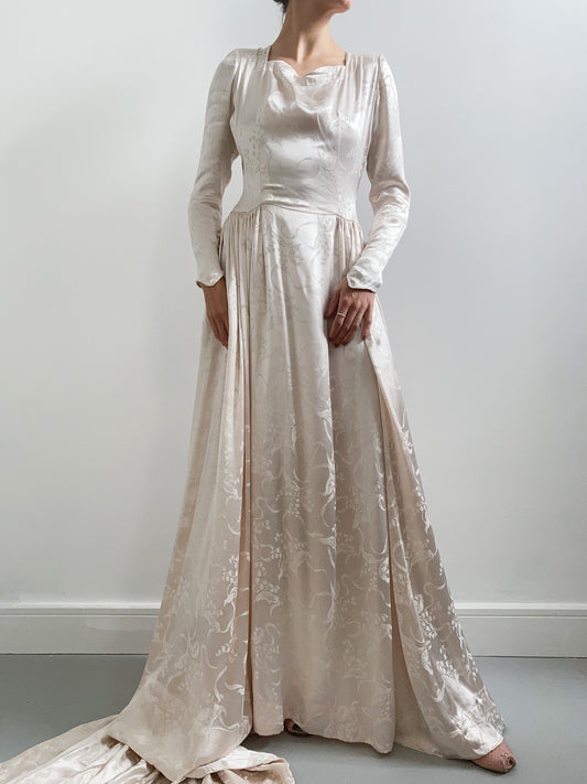 1940s Satin Charmeuse Wedding Dress with Pleated Detail and Train