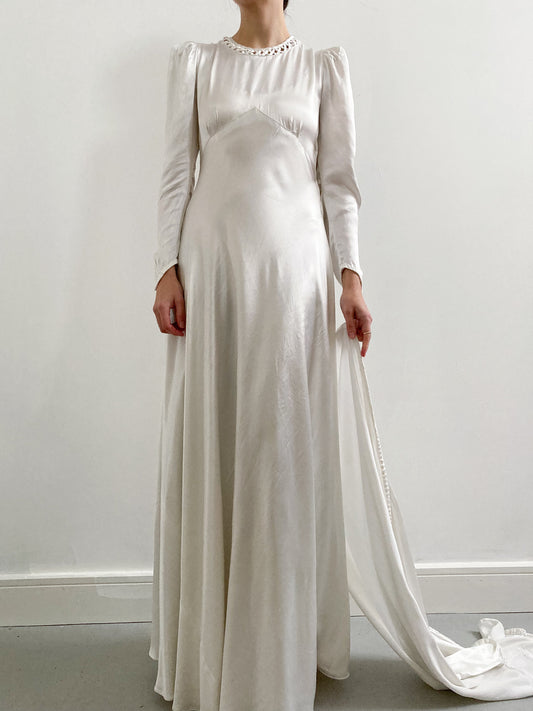1930s Ivory Satin Sleeveless Wedding Dress with Gathered Neck & Train