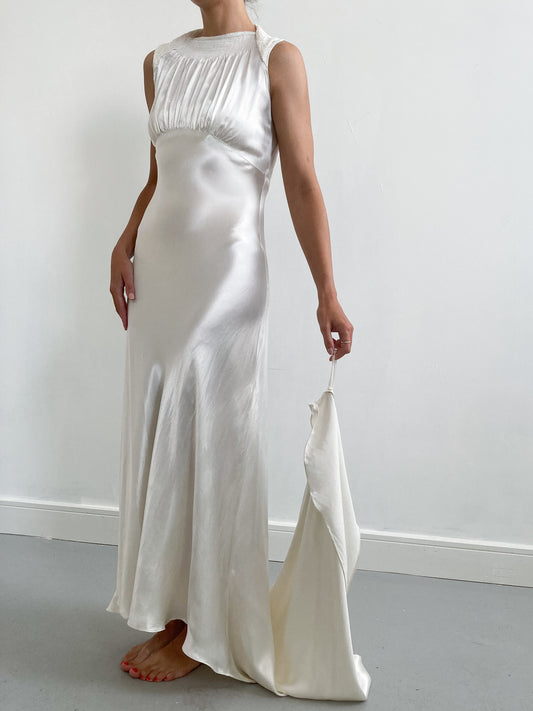 1930s Ivory Satin Sleeveless Wedding Dress with Gathered Neck & Train