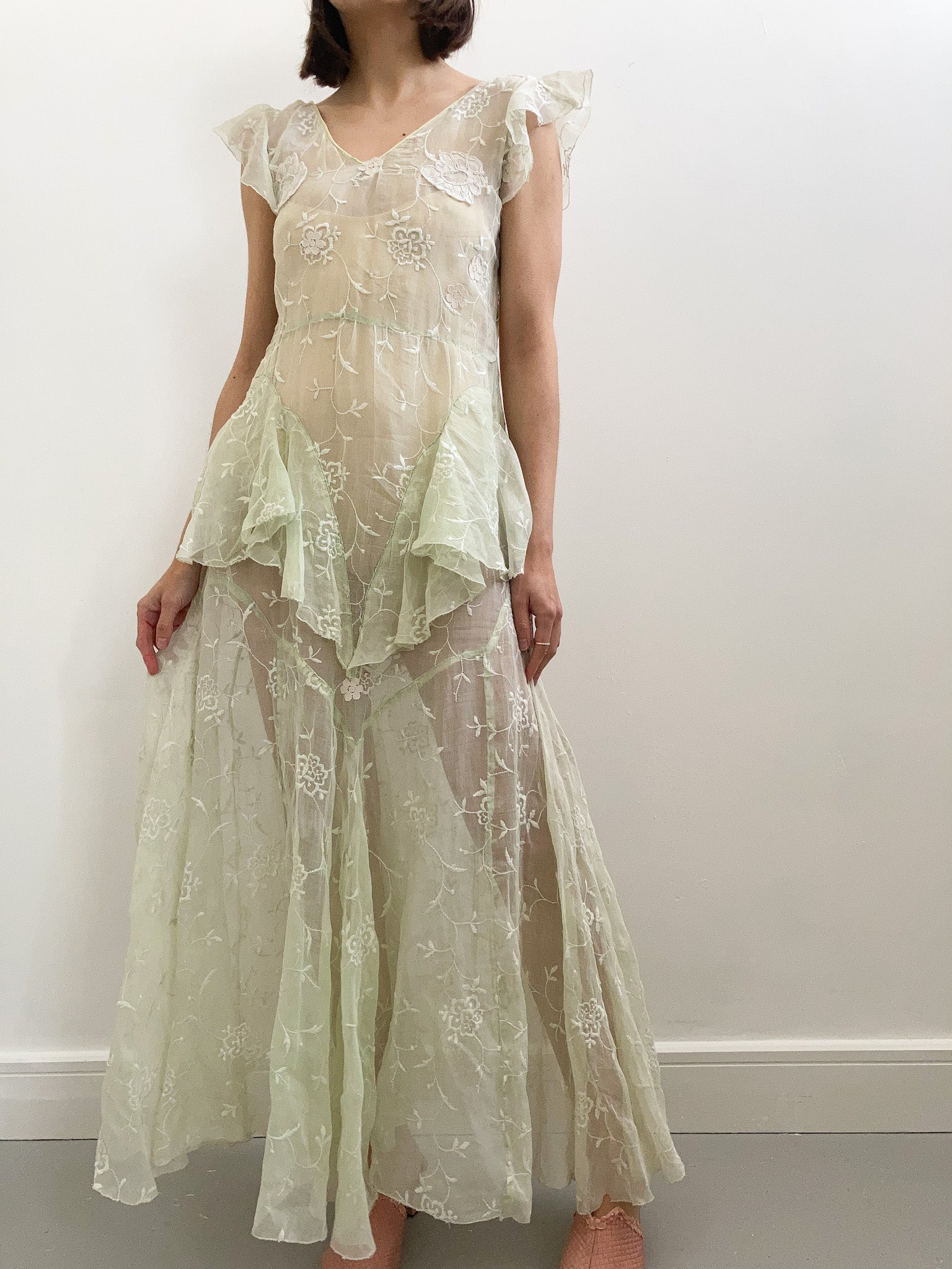 Absolutely breathtaking 1930s dress in pale green. Ankle length with a v-shaped neckline, flutter sleeves and ruffled peplum details at the waist. Made from light and breezy cotton organdy material with hand embroidered floral pattern and floral appliques. Perfect for a summer wedding or a special occasion.