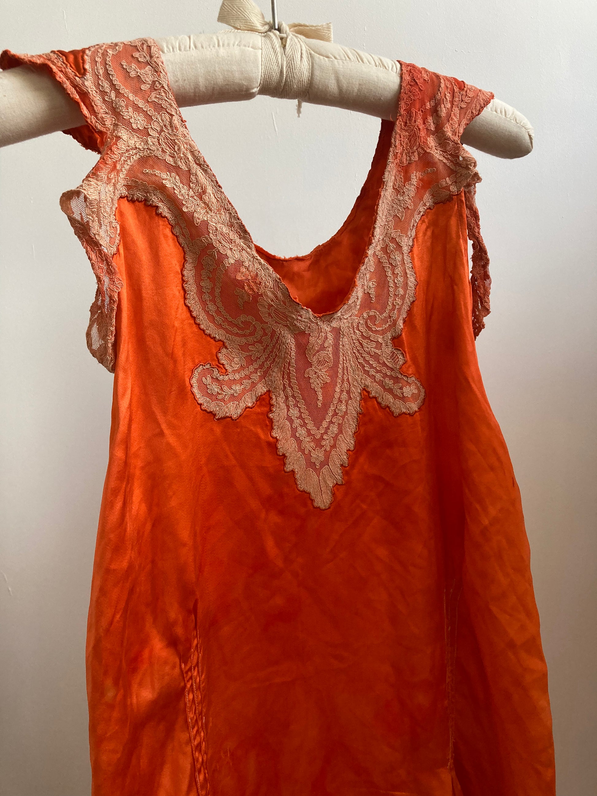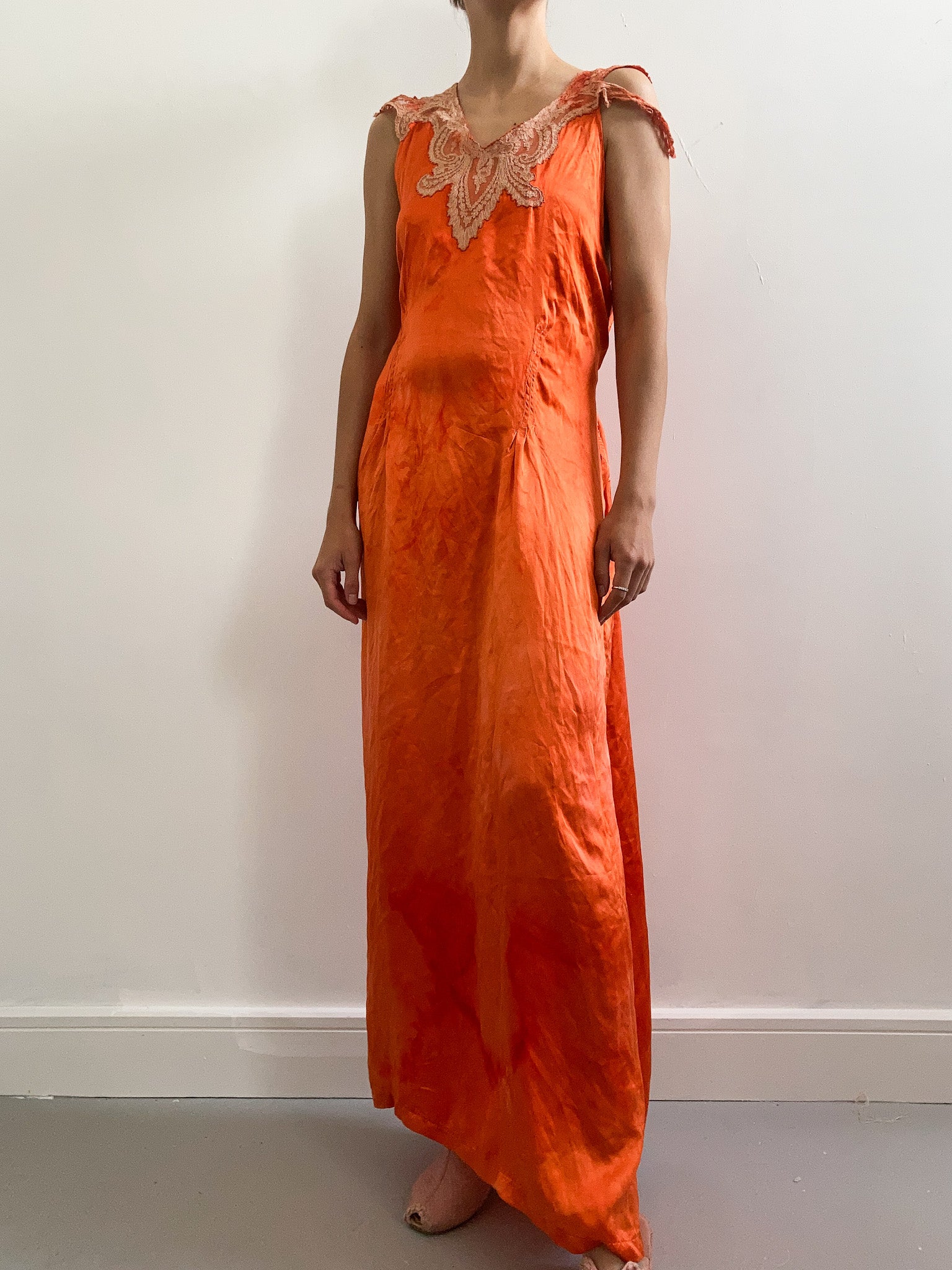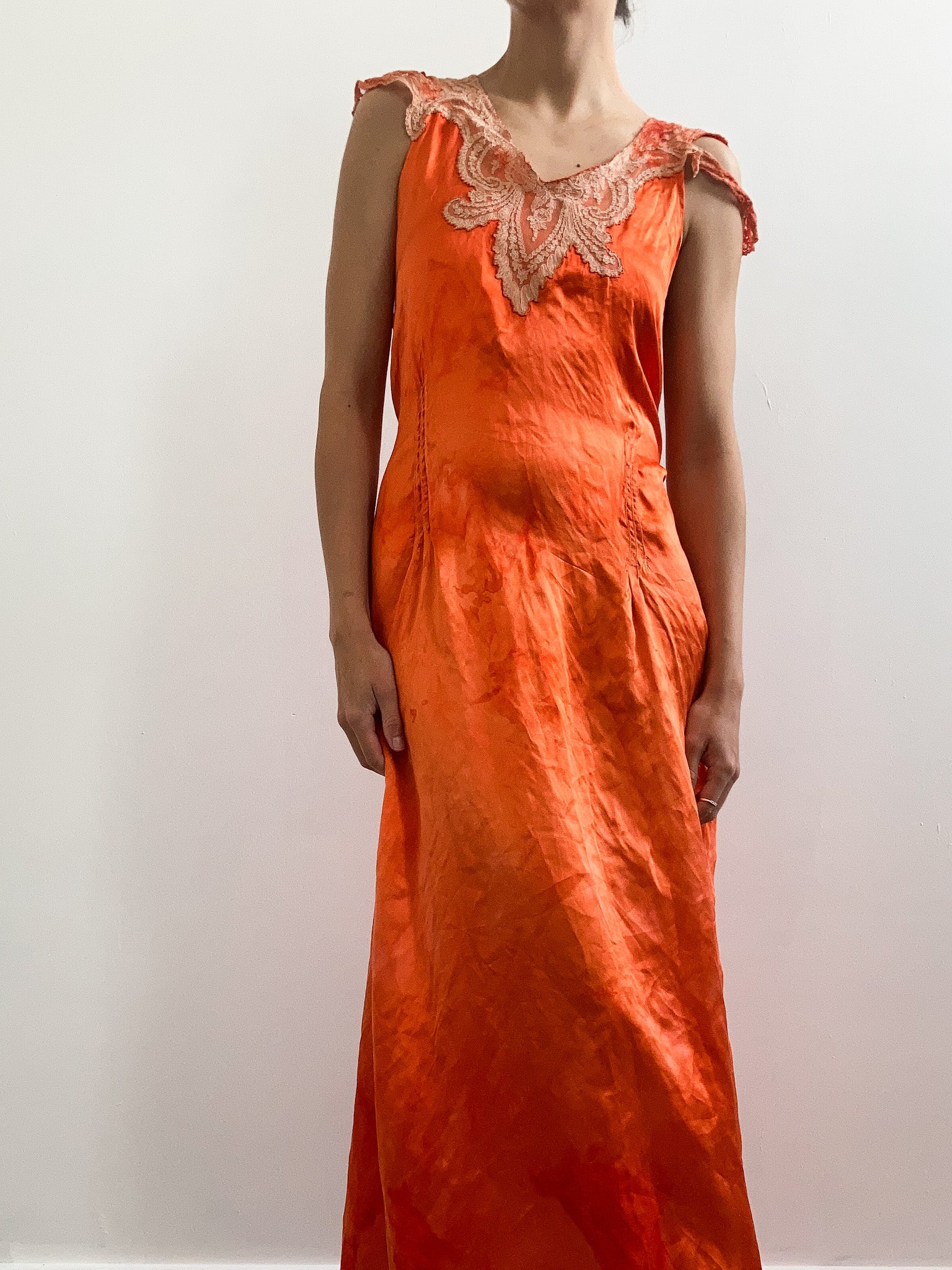 Breathtakingly beautiful vintage 1930s slip hand dyed in deep orange. Maxi length, simple fit, with a deep v-shaped neck finished in floral lace. Also features pintucks at the front and back with tie at the waist and unusual cap style sleeve. Made from lightweight silk satin, it's perfect to wear around the house or to the beach on a hot summer day.