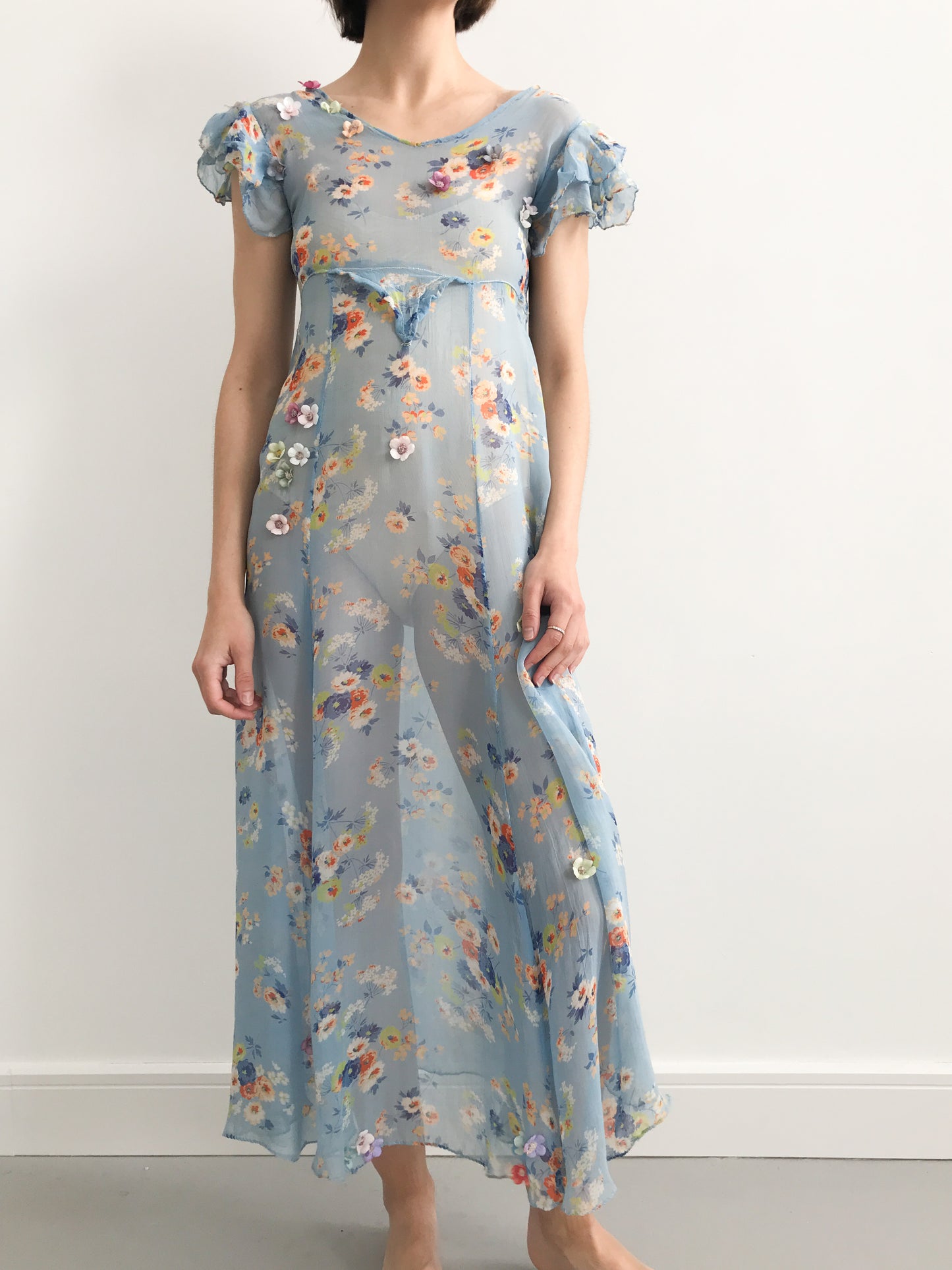Stunning vintage 1930s art deco dress in a gorgeous blue colour. Ankle length with a rounded neckline, small ruffled puff sleeves with netting and empire waistline with a v-shaped detailing attached to the dress with a popper button. The dress is cut on the bias and made up from semi sheer silk chiffon in multiple panels, with a stunning colourful floral pattern all over. It also features details such as hand stitched hems and a slightly asymmetrical, flowy skirt. The dress has been reworked with hand sewn floral appliques to restore it to its former glory and give it a new lease of life. Such a special and one of a kind piece, perfect for a special occasion or a summer party.