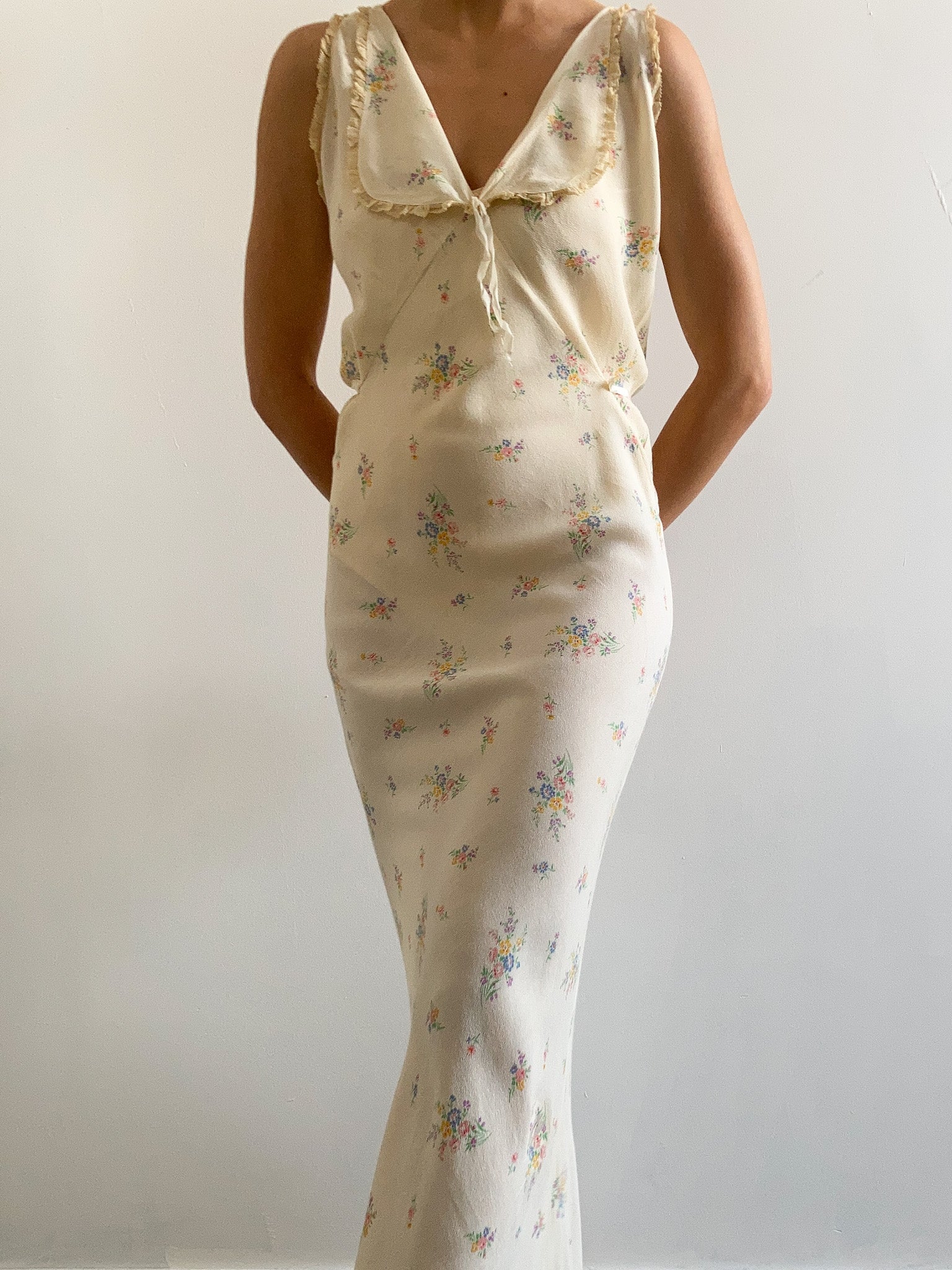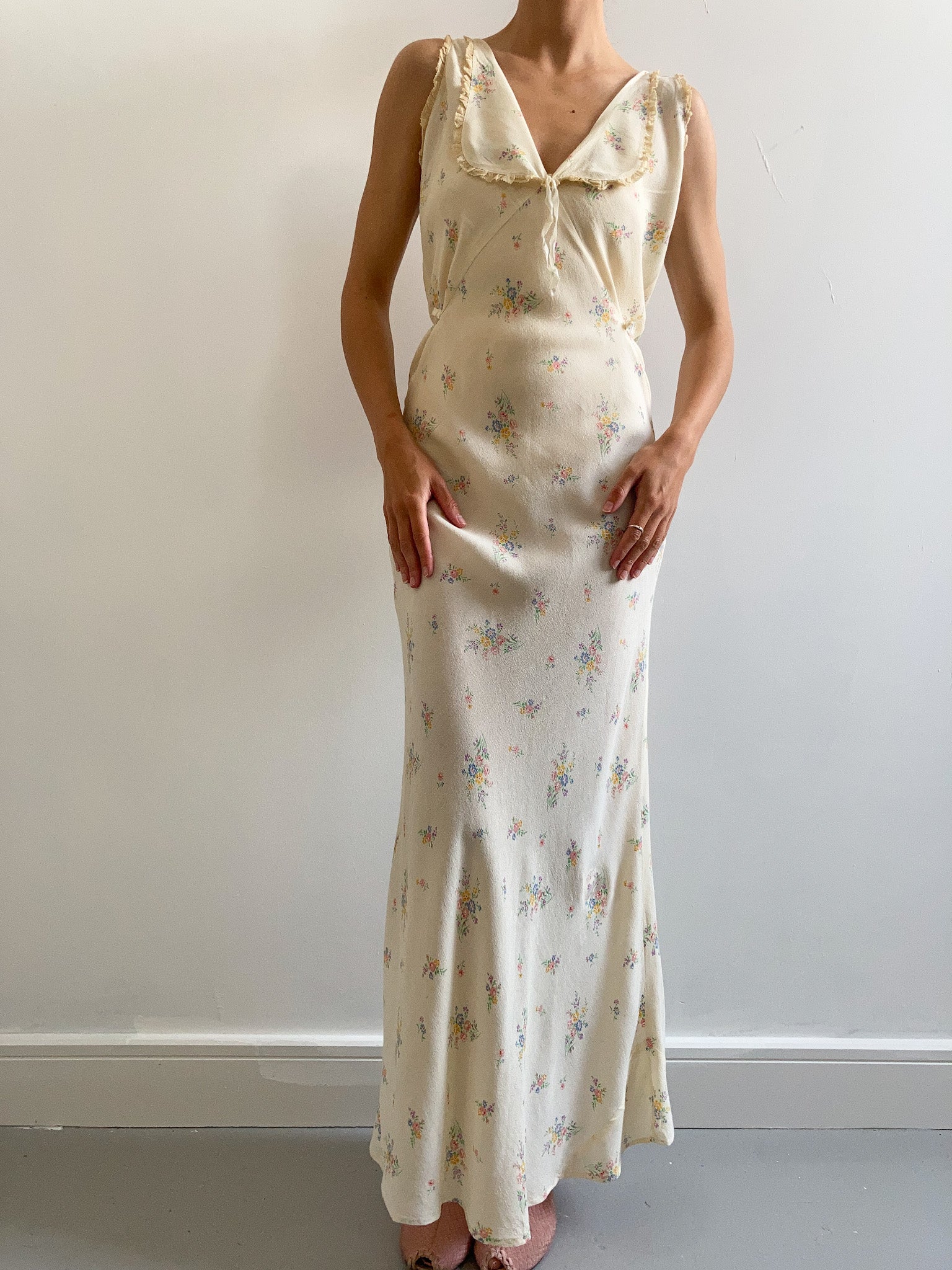 Absolutely stunning and unusual vintage 1930s slip gown in delicate yellow. Maxi length, cut on the bias, it features a lovely rounded collared neckline with bow detail, yellow lace trims and tie at the waist. Made from delicate crepe silk material in a romantic garden ditsy floral print pattern. Perfect for summer worn as a nightgown or a dress.