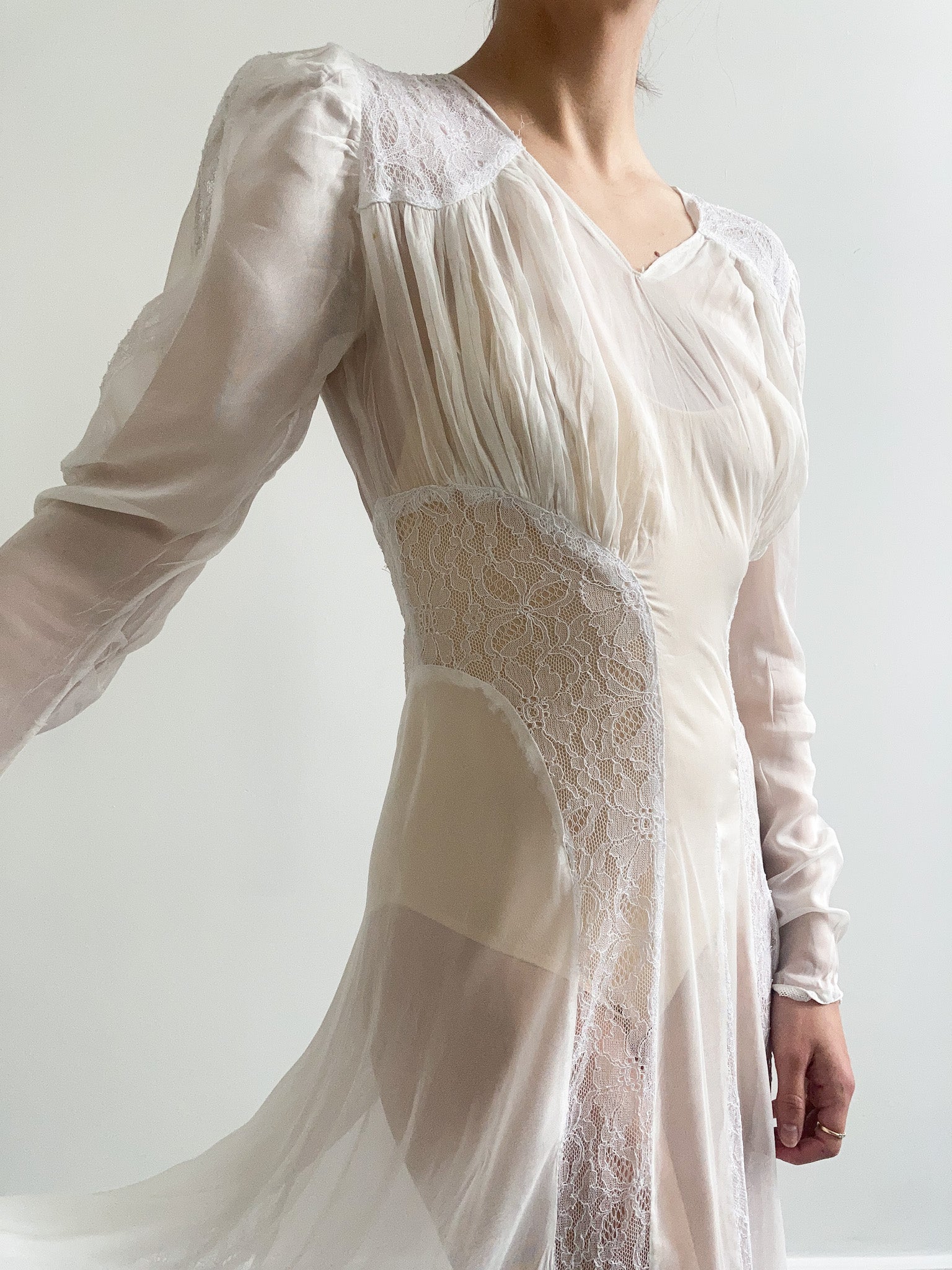 Romantic and breathtaking 1940s vintage wedding gown in ivory. Maxi length, it features a v-shaped neckline with gathered front, long button up sleeves, sexy button up back, empire waist and flared skirt with long train at the back. It also has gorgeous floral lace inserts at the shoulders, waistline and at the skirt, making it truly unique. Made from sheer lightweight crepe de chine material, it's perfect for a summer wedding worn with a simple slip underneath.