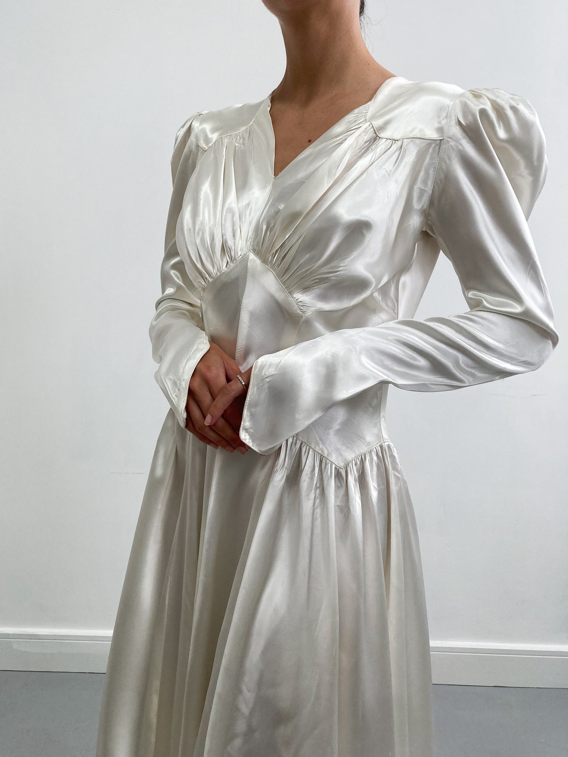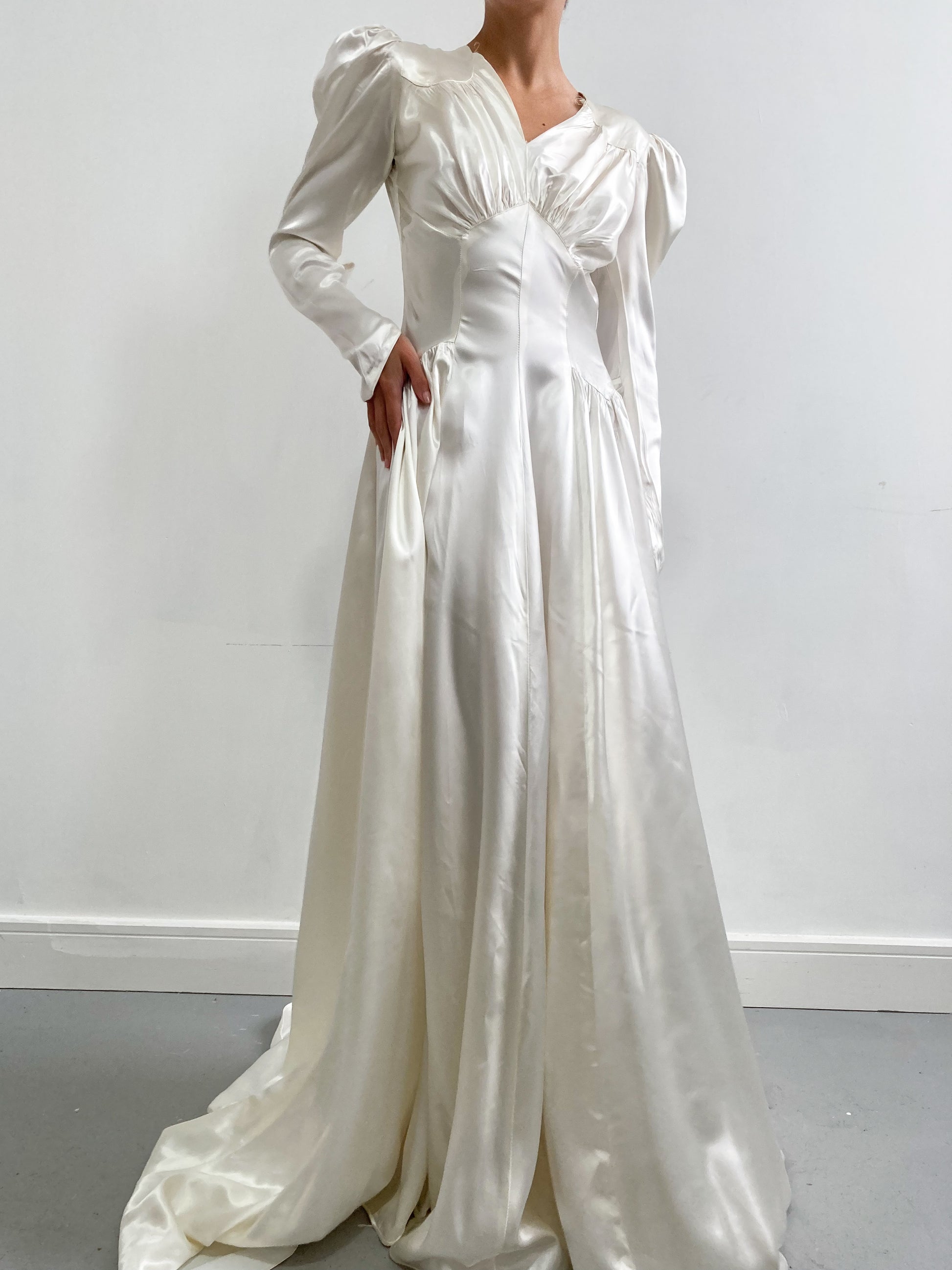 Gorgeous vintage 1940s wedding gown in warm ivory/light buttercream colour. Maxi length with a sweetheart style ruched neckline, pretty puff sleeves with long cuffs, accentuated waist and a-line skirt with a long train at the back. Hidden zip at the back with a button to close. Made from heavy satin, perfect for a fall/winter wedding. The material feels so luxurious on! A minimalist dress with character.