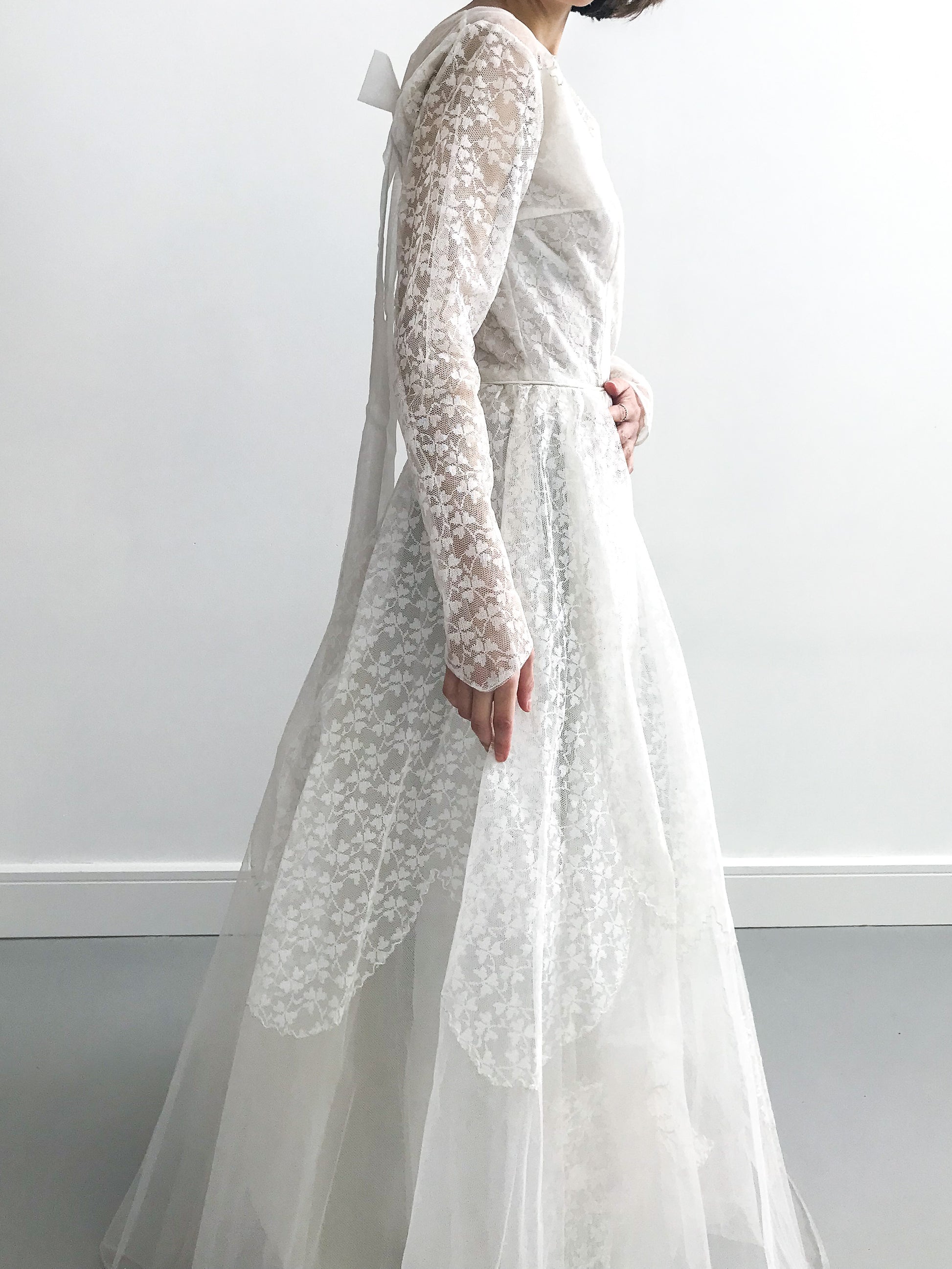 Vintage 1950s wedding gown in ivory. Maxi length with bow appliques along the flared skirt. The tulle lining gives it additional volume. Also features a boat style neckline, long reneaissance style sleeves and a bow detailing at the back. The outer layer is made from beautiful machine lace in a floral pattern. Such a special pieces.